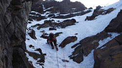 La ruta normal de subida a esta montaña no es muy técnica, pero normalmente preferimos escalar por su pared Oeste, mucho mas divertida y espectacular. Esta subida alterna tramos fáciles en glaciar a una parte final de pared que llega hasta los 50 grados de pendiente.